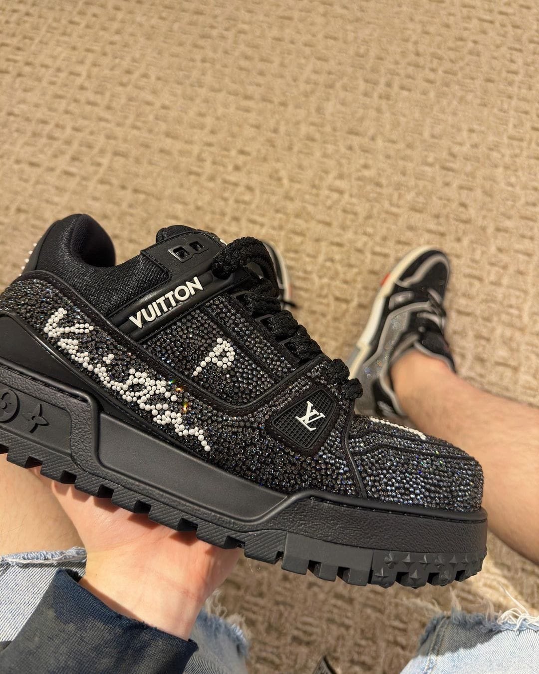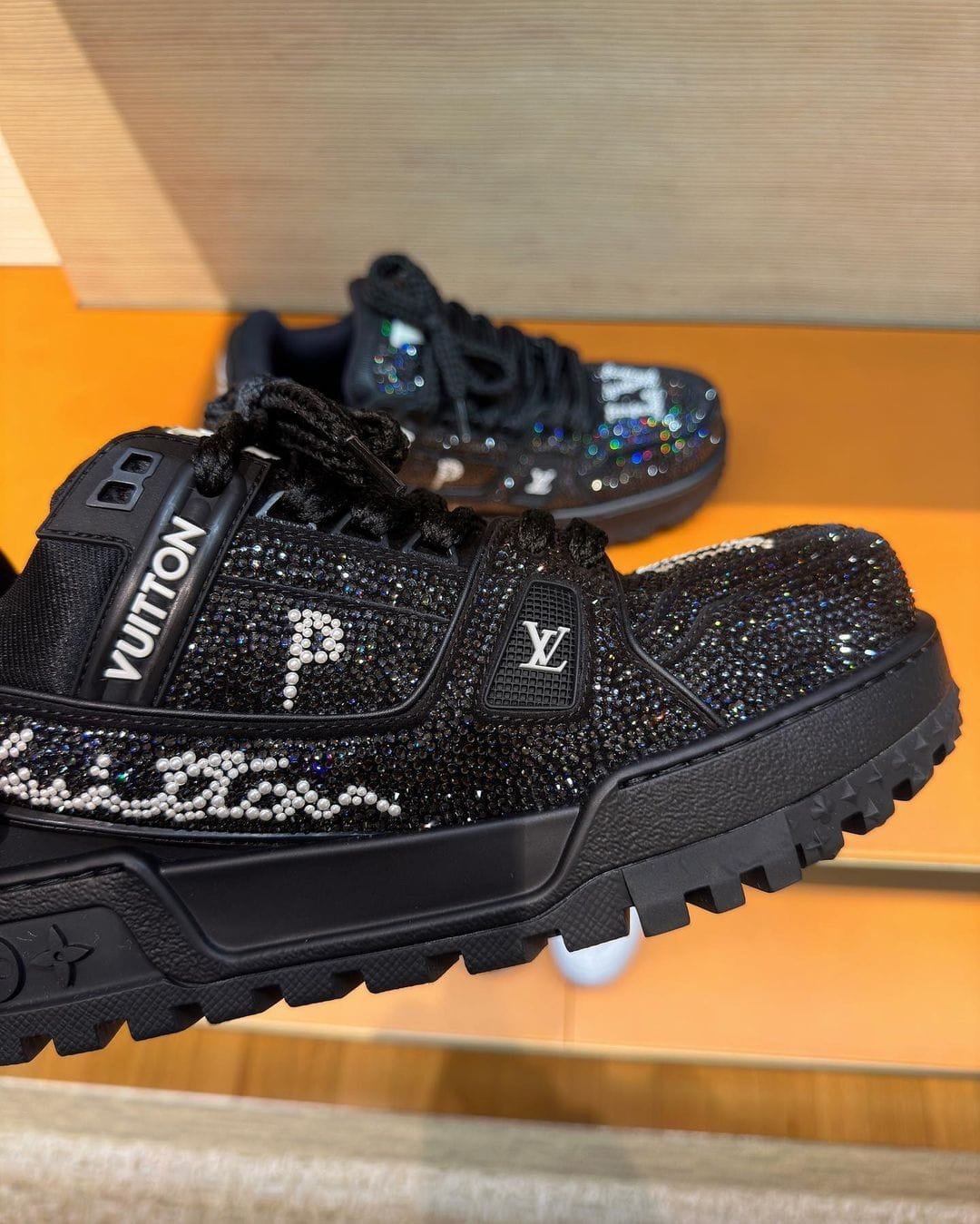 Buy our first copy Louis Vuitton Trainer Maxi Swarovski Crystal Black Diamond 7AAA quality shoes. They are completely flawless in every possible aspect right from the box. It comes into the exact detailing on the shoes, the marks, logos, stitching & everything has got the very finest bit of detailing you would expect in a high-end 7A quality Sneakers.